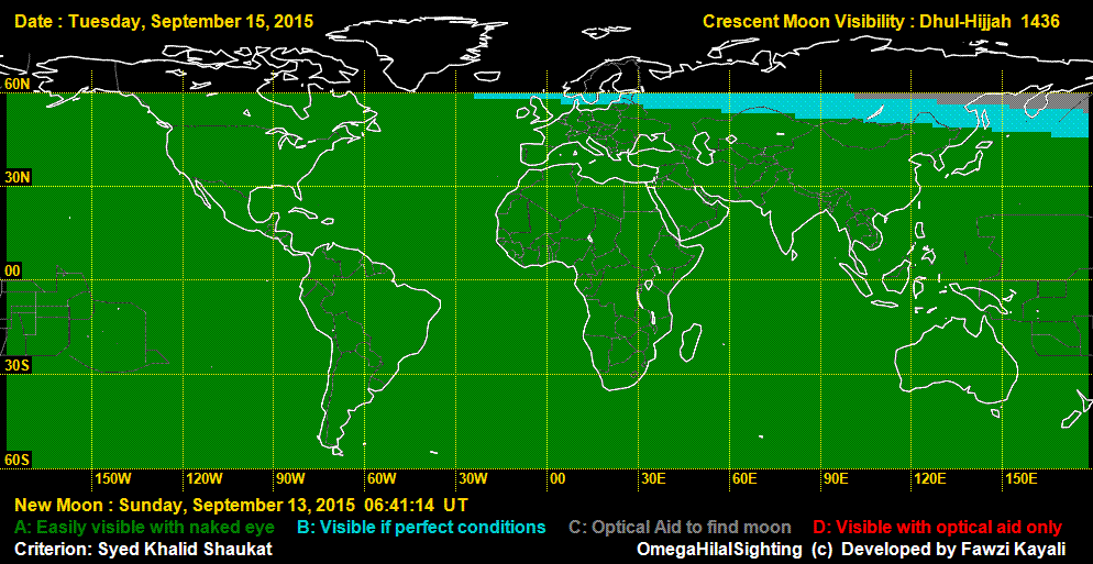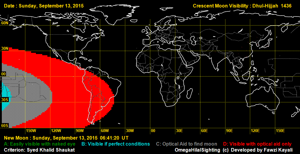 The Astronomical New Moon (conjunction) is on September 13, 2015 (Sunday) at 6:41 UT. On September 13, the moon cannot be seen in most of the world, except possibly with difficulty in Polynasian Islands. On September 14, 2015 (Monday), this moon can be seen with difficulty from Australia, Indonesia, South-East Asia, and Northern Africa; it can easily be seen in rest of Africa and all Americas. On September 15, 2015 (Tuesday) the moon be seen in almost the whole world (See visibility curves).