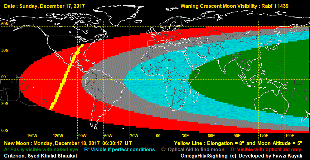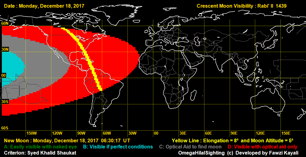 The Astronomical New Moon (conjunction) is on December 18, 2017 (Monday) at 6:30 UT. On December 18, the moon can be seen by telescope in USA. On December 19, the crescent can be seen in Middle East, Africa and Americas. On December 20, it will be easily visible in New Zealand and Australia and everywhere in the world. (See visibility curves).