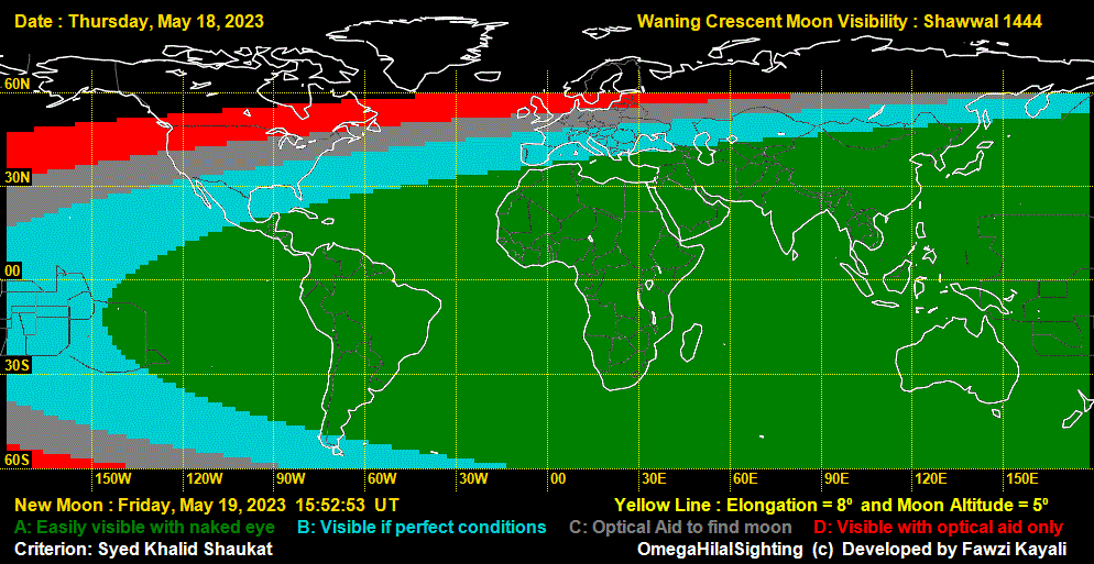 On May 19, the moon can not be seen any where in the world. On May 20, it can be seen with difficulty in Far East and parts of Europe and Southern Africa. On May 20, it can be easily seen in parts of Northern Africa and Southern Europe as well as in Americas. On May 21, it can be seen in the whole world (See visibility curves).