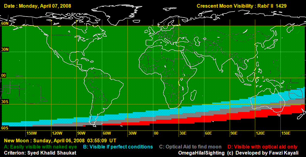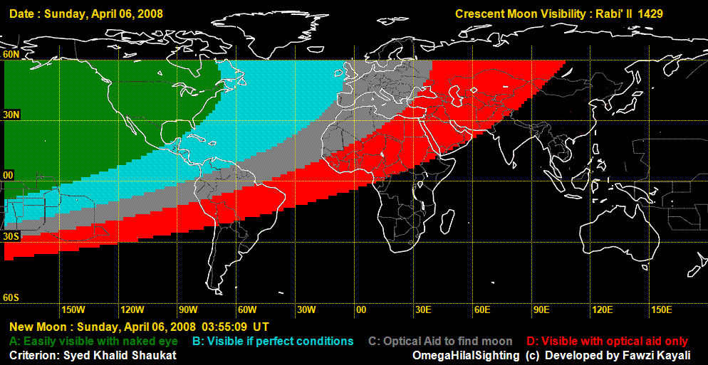 The Astronomical New Moon is on April 6, 2008 (Sunday) at 3:55 Universal Time or GMT (i.e., 11:55 pm EDT on April 5, and 8:55 am PDT on April 5). It will be easily visible on April 6, in North America, even in Alaska. It will be visible in Northern Europe and Northwest Africa with difficulty on April 6. It will be visible all over the world except New Zealand on April 7, Insha-Allah. In New Zealand, it will be visible on April 8.