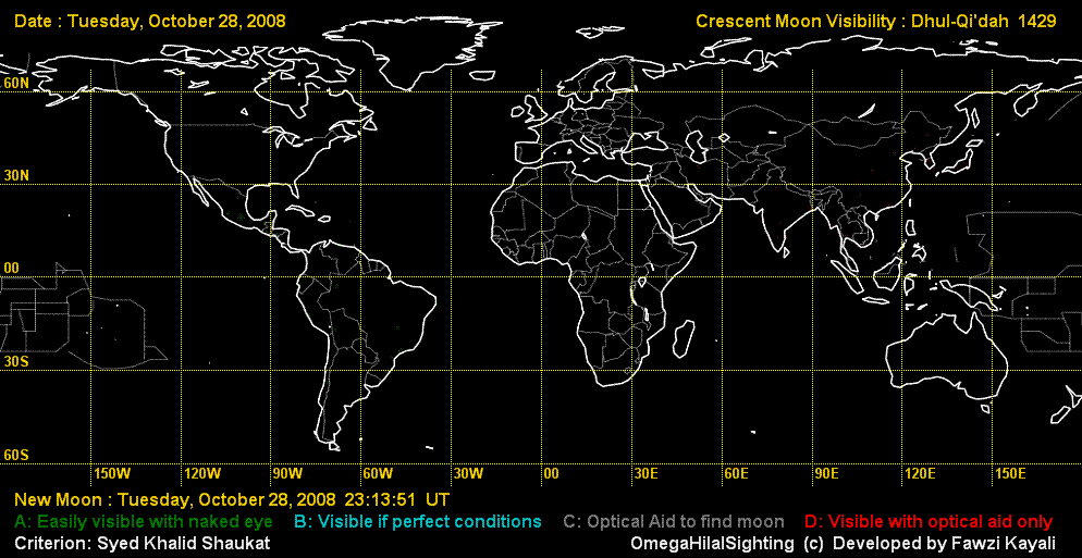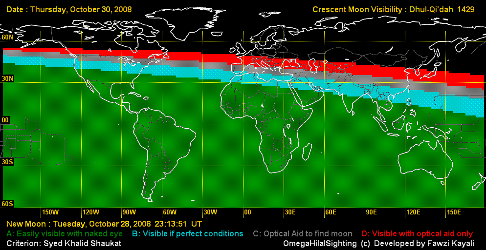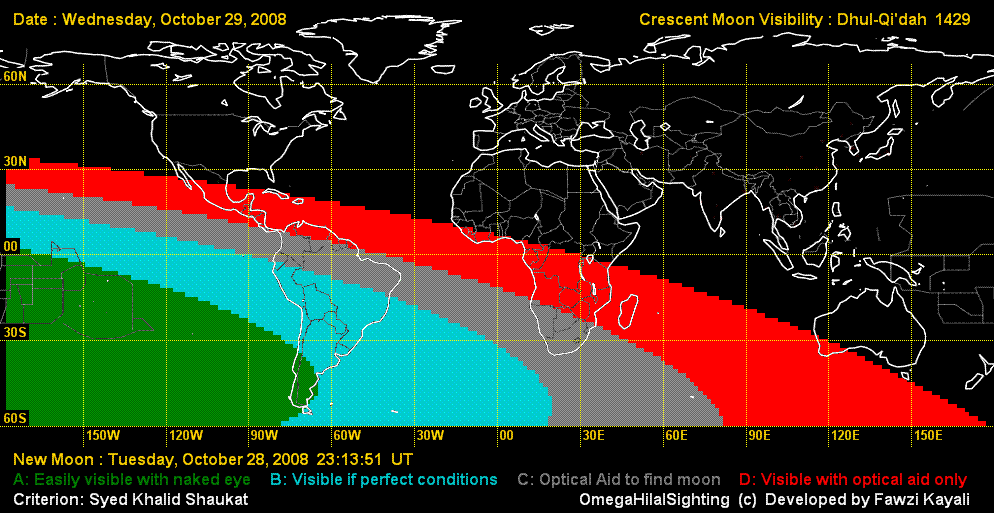 Note: Chairman of central official moon sighting committee of Pakistan "Mufti Munee-bur-Rahman" told me on my personal mobile phone that because he did not receive any positive report of moon sighting from all over Pakistan, therefore he has officially announced that Thursday 30 October 2008 is the 30th Shawwal and 1st Zul-Qa�dah 1429 will fall on Friday 31 October 2008 in Pakistan.