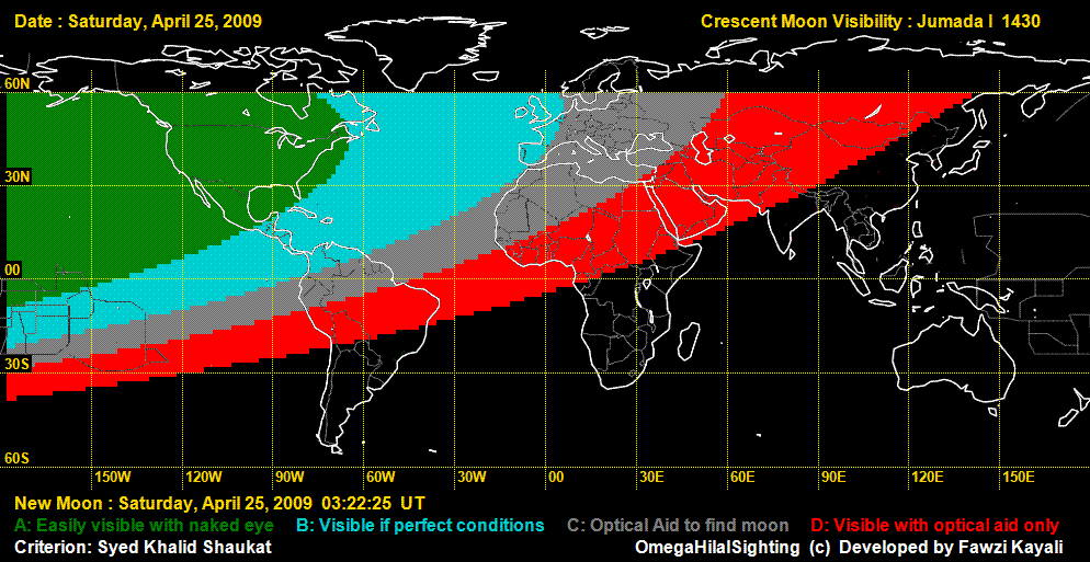 The Crescent Moon was sightied on Saturday, April 25 in USA. Due to technical difficulties, some of sighting reports were lost from the computer.