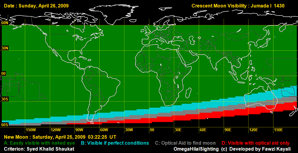 Today i.e. on Sunday 26 April 2009 (29 Rabee-uth-Thani 1430) On my request many hundred members and friends of our institute �Jamia-tur-Rasheed� easily sighted the moon at many places in 3 provinces of Pakistan i.e. in Baluchistan, Sindh & Punjab. As it was fully cloudy in NWFP hence not to speak of the crescent moon, the sun was invisible there.
