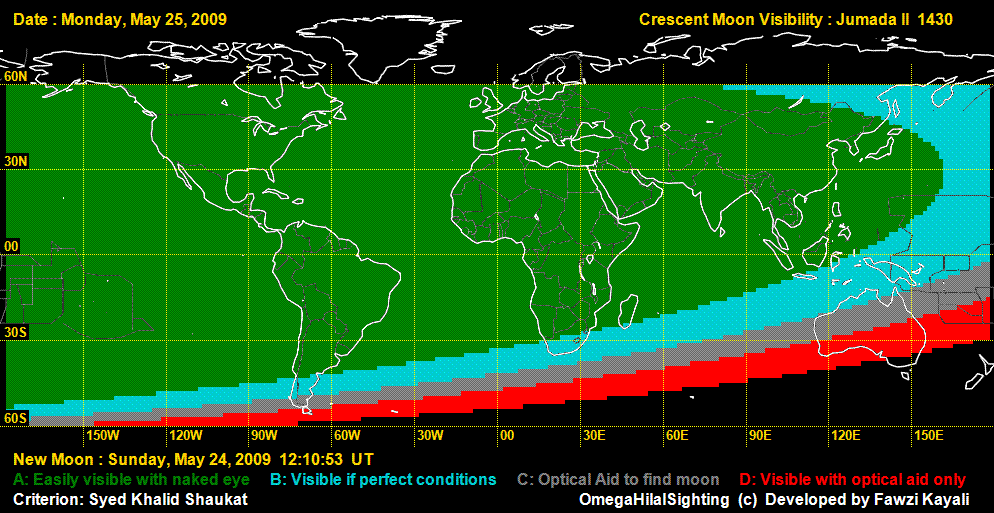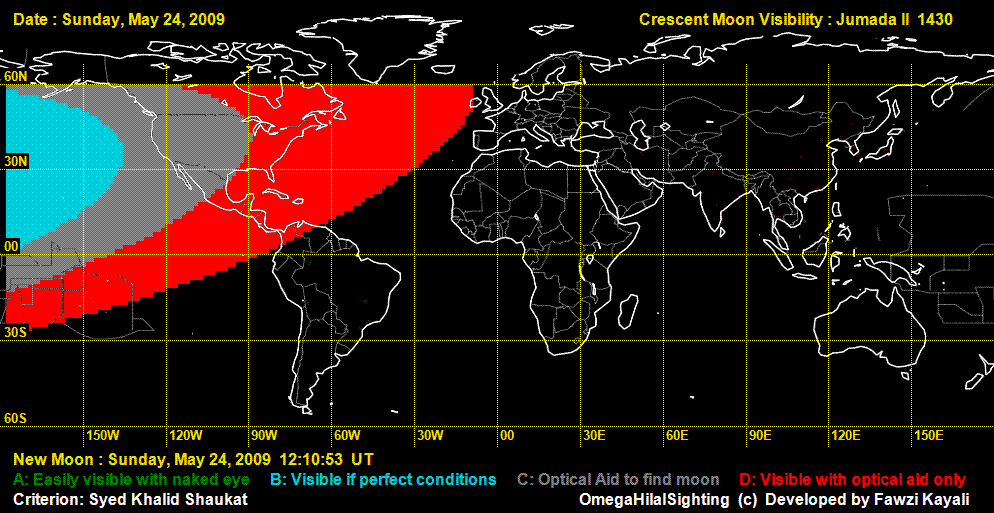 The Astronomical New Moon is on Sunday, May 24, 2009 at 12:11 UT. On this day, this moon can only be seen with difficulty in Western USA and Canada. On May 25, it can be seen everywhere in all continents of the world, except New Zealand. In Australia, it can be seen only in Northern Australia and with difficulty.