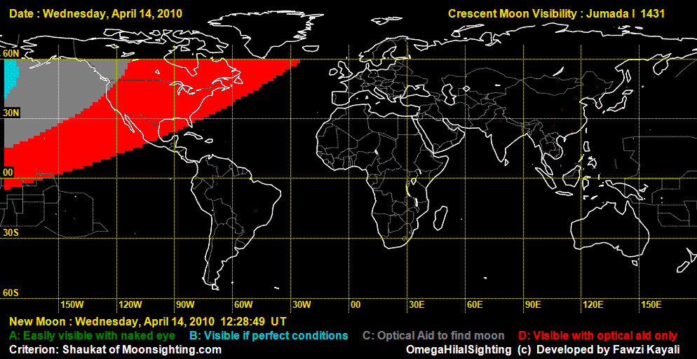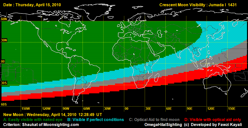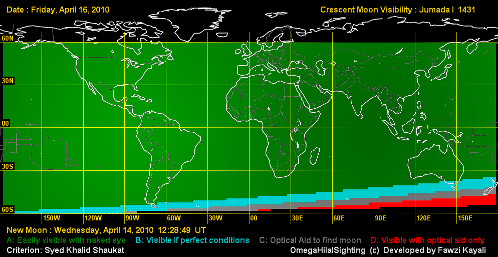 |  | Moonsighting for Jumada-al-Oola 1431The Astronomical New Moon is on 14 April 2010 (Wednesday) at 12:29 UT. On 14 April, this moon can not be seen anywhere by naked eye. On 14 April, by telescope it may be seen in North America only, as shown in the visibility map. On 15 April, it will be easily visible in most asia, all europe, Africa, and Americas, but impossible to see in New Zealand, Australia, and southern tips of Africa and South America.