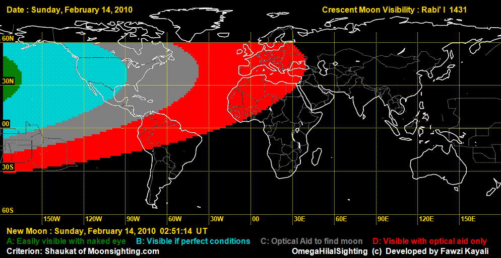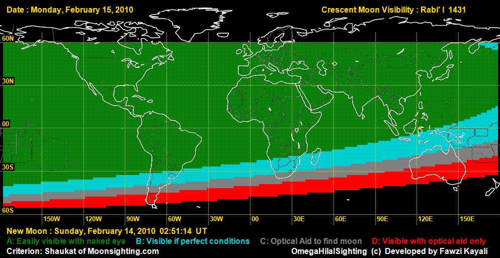|  | Moonsighting for Rabi-al-Awwal 1431The Astronomical New Moon is on 14 February 2010 (Sunday) at 2:51 UT. On 14 February, with difficulty it may be visible in Central and North America, and by telescope it may be seen in Europe, Northern Africa and Northern countires of South America. On 15 February, it will be easily visible all over the world except New Zealand, and Australia. See the visibility map below: