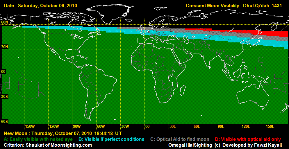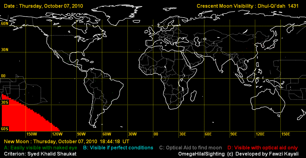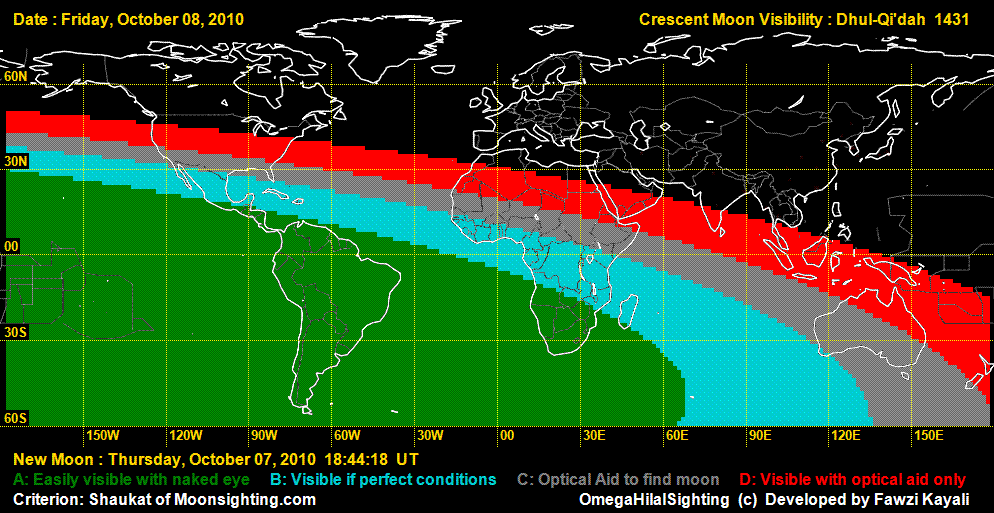 The Astronomical New Moon is on 7 October 2010 (Thursday) at 18:44 UT. On October 7, it cannot be seen anywhere in the world. On 8 October, in Northern Africa and South America, it can be seen easily, but with difficulty in the rest of Africa and Central America. On the same day it may be seen by telescope in New Zealand, Northern Africa, and North America, while it cannot be seen in Asia and Europe. See the visibility map below:
