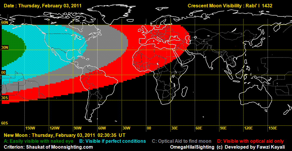 The Astronomical New Moon is on Thursday February 3 at 2:31 UT. On Feb 3 it can only be seen in North America. On Feb 4, it can be seen all over the world except New Zealand and Australia. Northern Australia may see it with difficulty (See visibility curves).