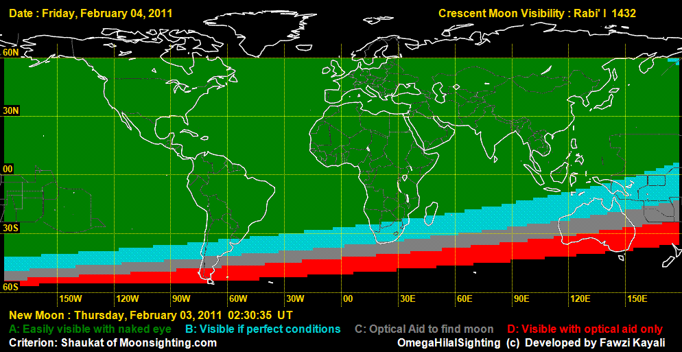 Note 1: Chairman of central official moon sighting committee of Pakistan mufti munee-bur-Rahman told me on my mobile phone that as he also did not receive any positive report countrywide therefore he announced officially that Friday 4 February is 30th Safar and Saturday 5 February 2011 is 1st Rabee-ul-Awwal 1432 in Pakistan.