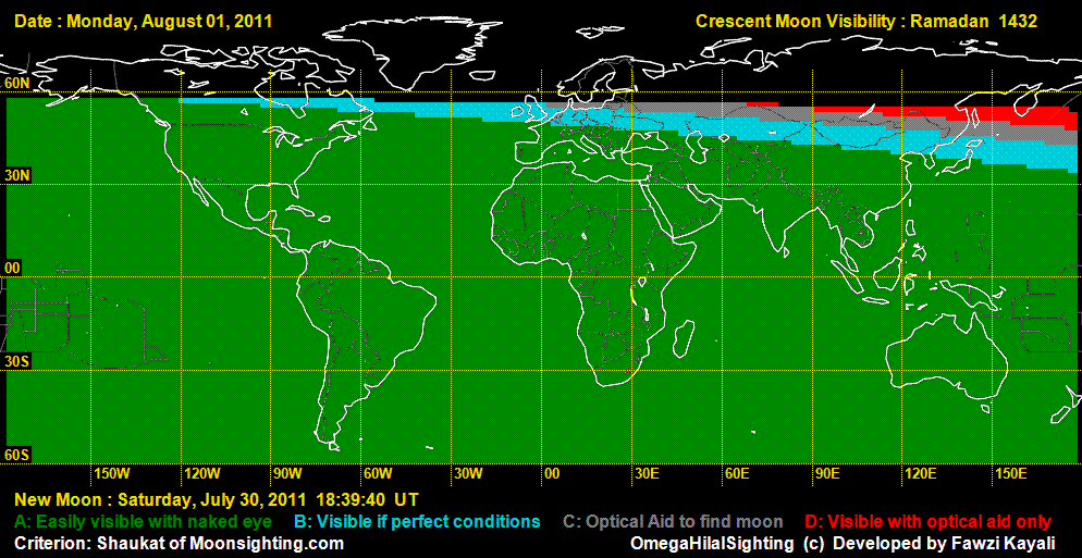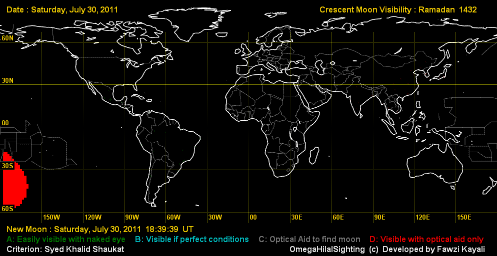 The Astronomical New Moon is on July 30, 2011 (Saturday) at 18:40 UT. On July 30, it can not be seen anywhere in the world. On Sunday, July 31, 2011, it can be easily seen in Southern Africa and South America, but with difficulty in Central Africa. On August 1, it can be easily seen everywhere except Northern Europe (See visibility curves).