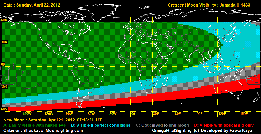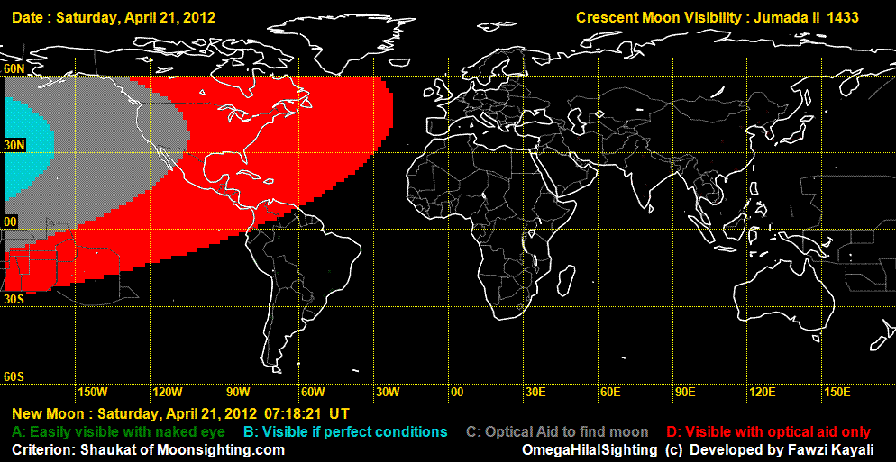 The Astronomical New Moon is on April 21, 2012 (Saturday) at 7:18 UT. On Saturday, April 21, it can not be seen anywhere in the world by naked eye. It is possible in North America that using telescope, it can be seen. On Sunday, April 22, 2012, it can easily be seen in Asia, Europe, Africa and Americas, but not in Australia (See visibility curves).