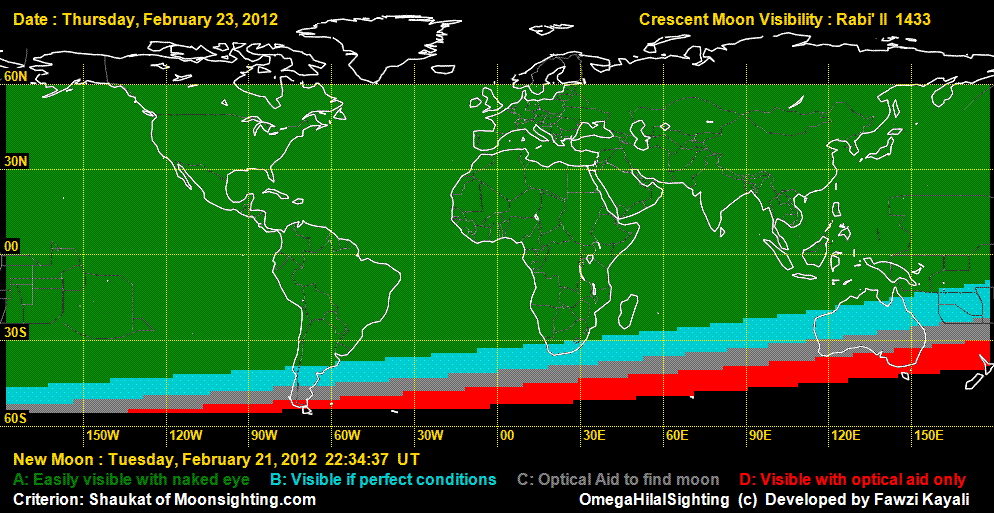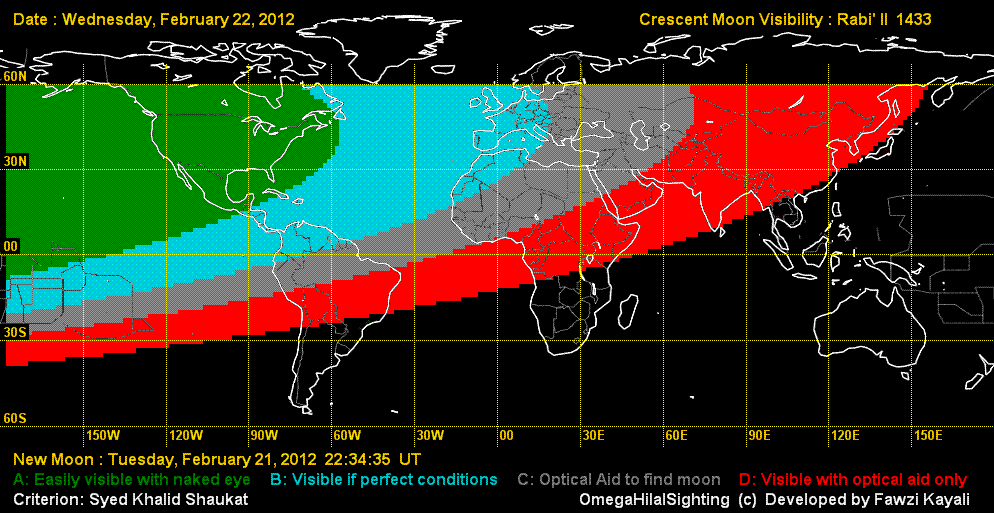 The Astronomical New Moon is on February 21, 2012 (Tuesday) at 22:35 UT. On Tuesday, February 21, it can not be seen anywhere in the world even by telescopes. On Wednesday, February 22, 2012, it can be seen in Europe, Northern Africa, with some difficulty. However, it should be easily seen in North Amrica. On Thursday, February 23, it can be in the rest of the world (See visibility curves).
