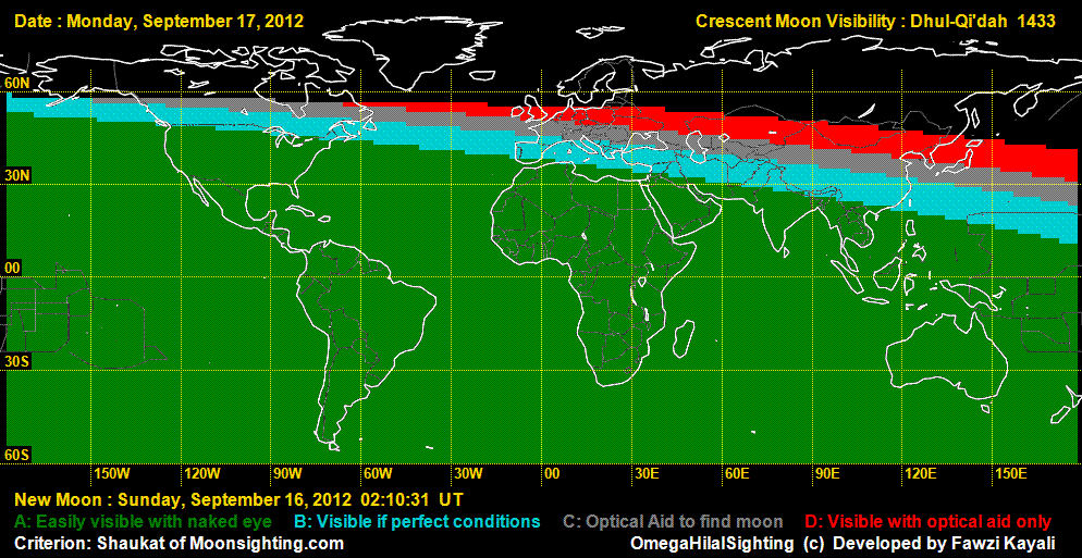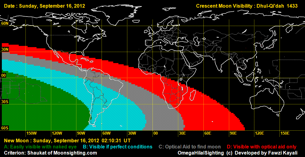 The Astronomical New Moon is on September 16, 2012 (Sunday) at 2:11 UT. On Sunday, September 16, it can not be seen anywhere in the world, except part of South Africa, South America and Polynesian Islands. On Monday, September 17, 2012, it can be easily seen in New Zealand, Australia, South-East Asia, Africa and Americas (See visibility curves).
