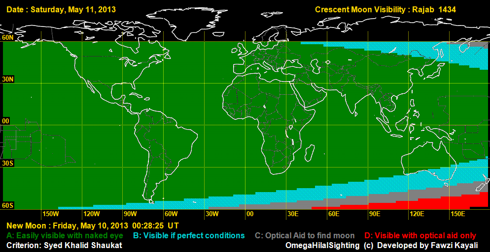 The Astronomical New Moon is on May 10, 2013 (Friday) at 00:28 UT. On May 10, it can be seen with difficulty in USA, Central America, and North-western areas of South America. On that day, it can be easily seen in Hawaii, and some Polynesian Islands. On Saturday, May 11, 2013, it can be seen all over the world with ease. (See visibility curves).
