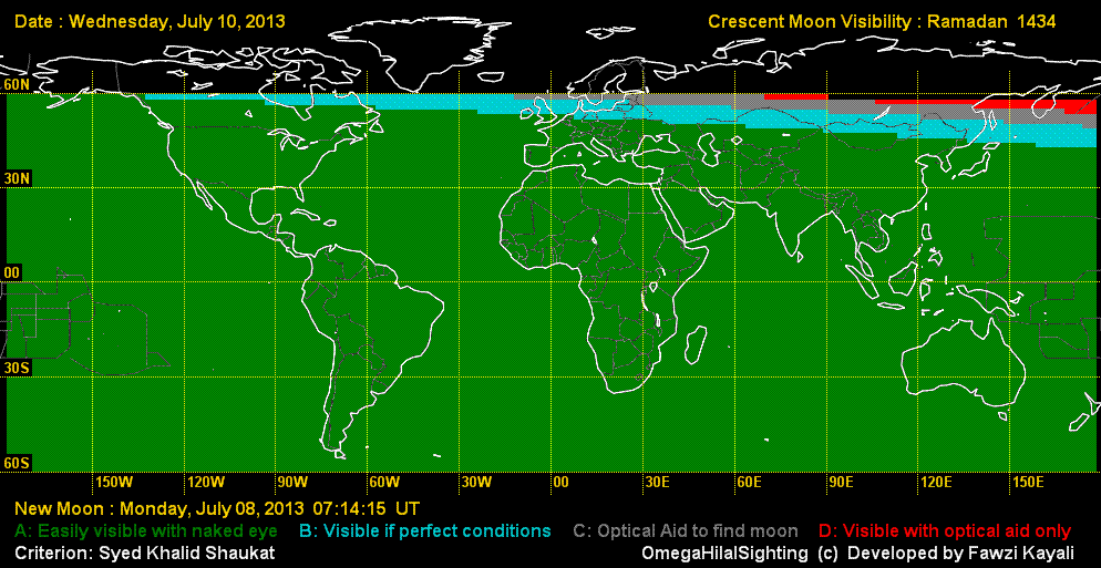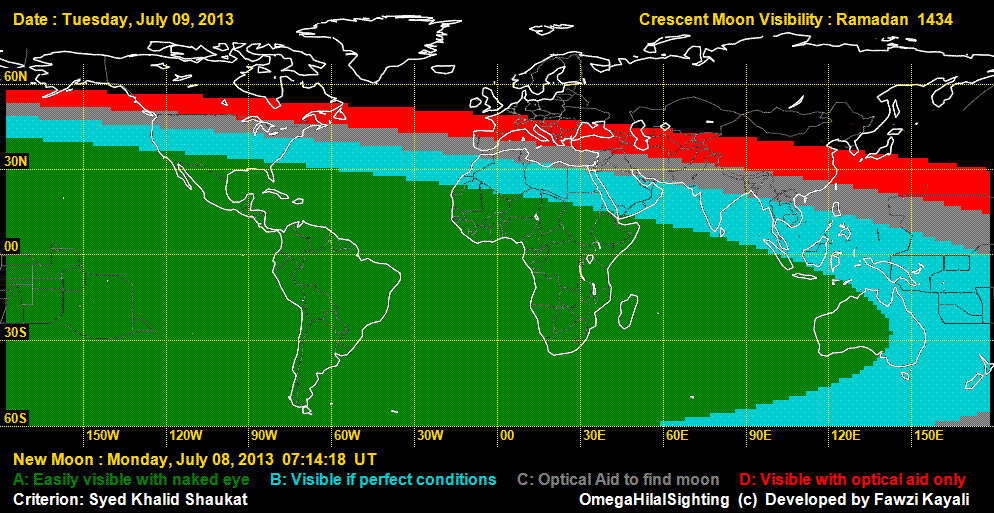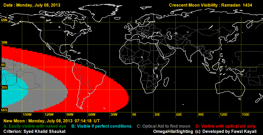 The Astronomical New Moon is on July 8, 2013 (Monday) at 7:14 UT. On July 8, it can not be seen any continent, but it is possible to be seen in Polynesian Islands. On Tuesday, July 9, 2013, it can be seen in Australia, most Africa and all Americas. On July 9, with diffuculty, it can be seen in Southern India, Middle East, and Northern Africa. (See visibility curves).