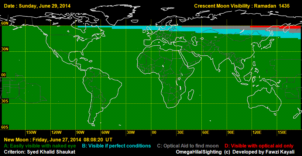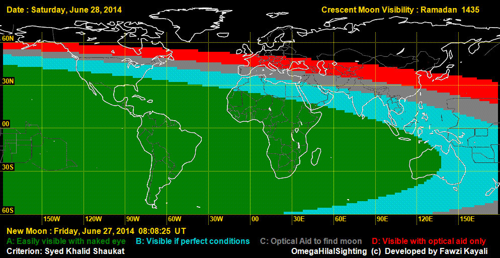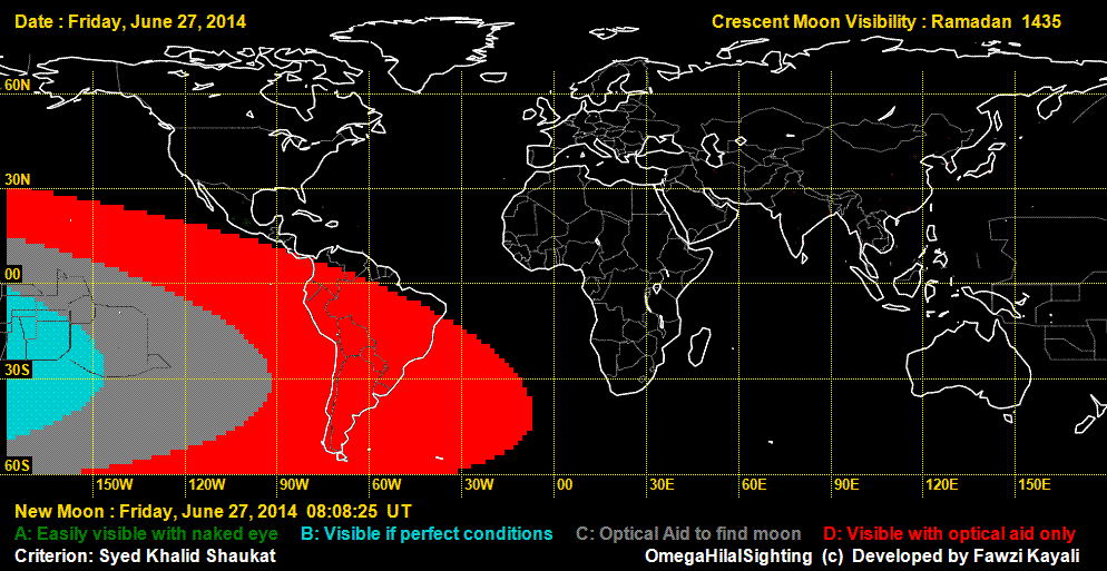 The Astronomical New Moon is on Friday June 27, 2014 at 8:08 UT. There is very small possibility of moonsighting by telescope in South America on that day. On June 28, the moon can be seen with difficulty in Indonesia and South-east Asia, but can easily be seen in Australia, Africa, and Americas (See visibility curves).