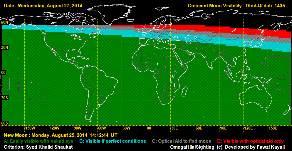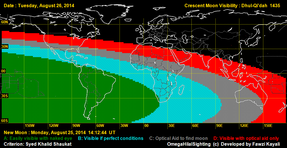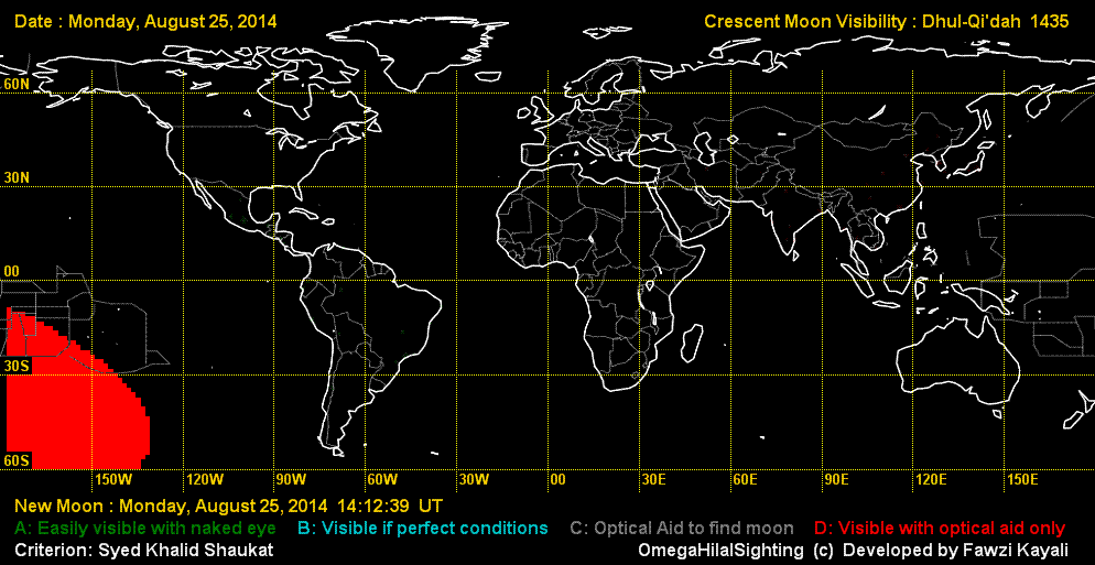 The Astronomical New Moon is on Monday August 25, 2014 at 14:13 UT. There is no possibility of moonsighting on that day. On August 26, the moon can be seen with difficulty in Africa and Central America, but can easily be seen in South America. On August 27, the moon can be easily seen in almost the whole world (See visibility curves).