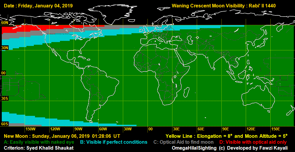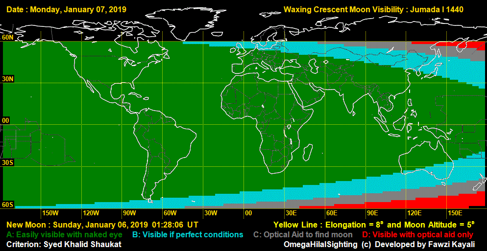 The Astronomical New Moon (conjunction) is on January 6, 2019 (Sunday) at 1:28 UT. On January 6, there is no possibility to see this moon, except by telescope in Americas. On January 7, 2019 (Monday) the moon can be easily seen in the whole world except New Zealand (See visibility curves).