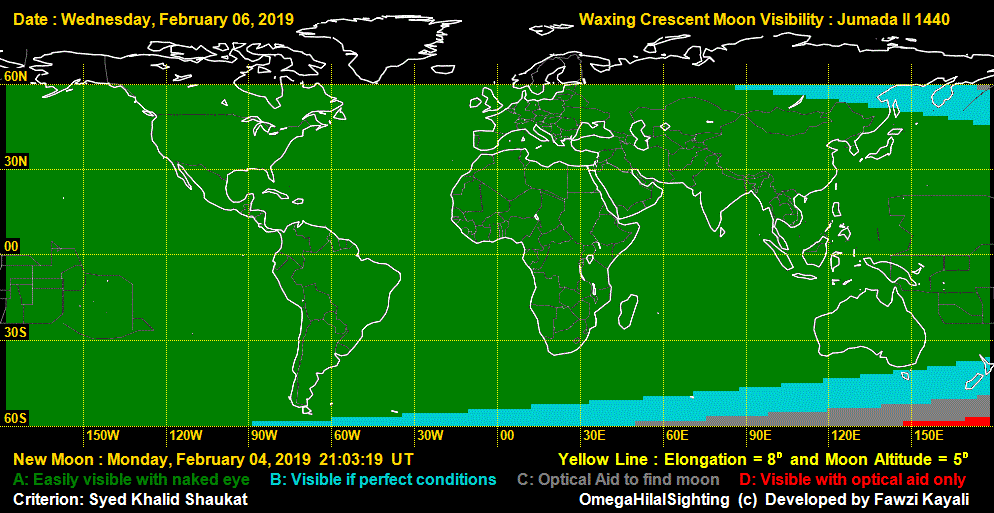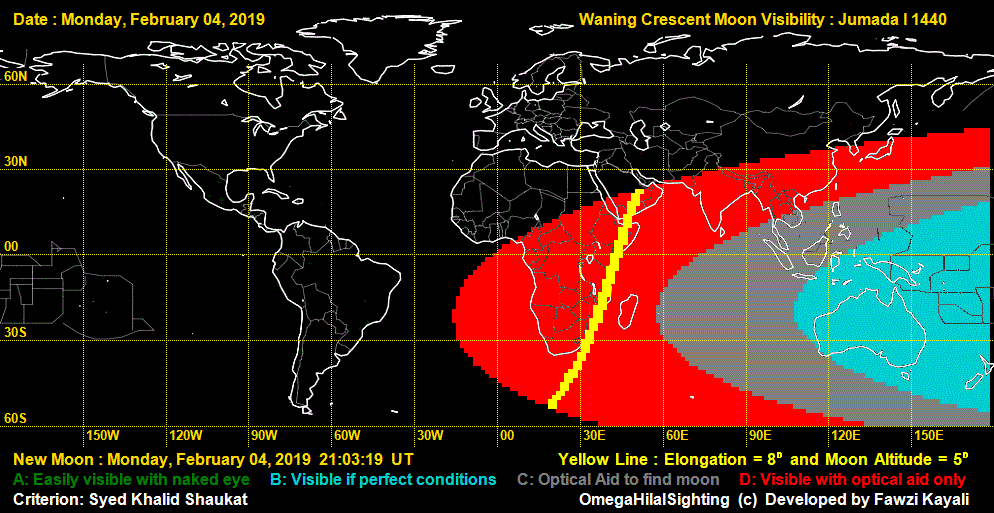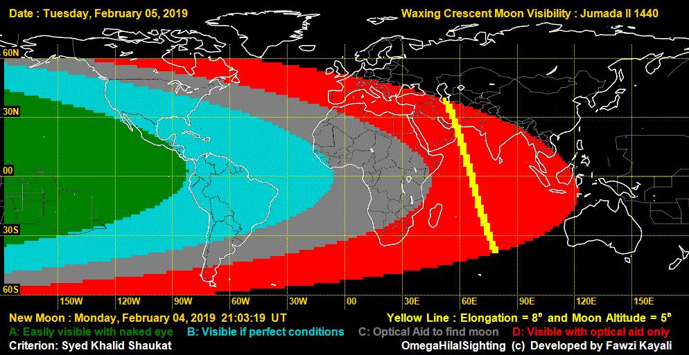 This determination is based on the fact that there were verified sightings of the crescent moon by the naked eye at sunset on Tuesday, February 5th, 2019 from many locations.