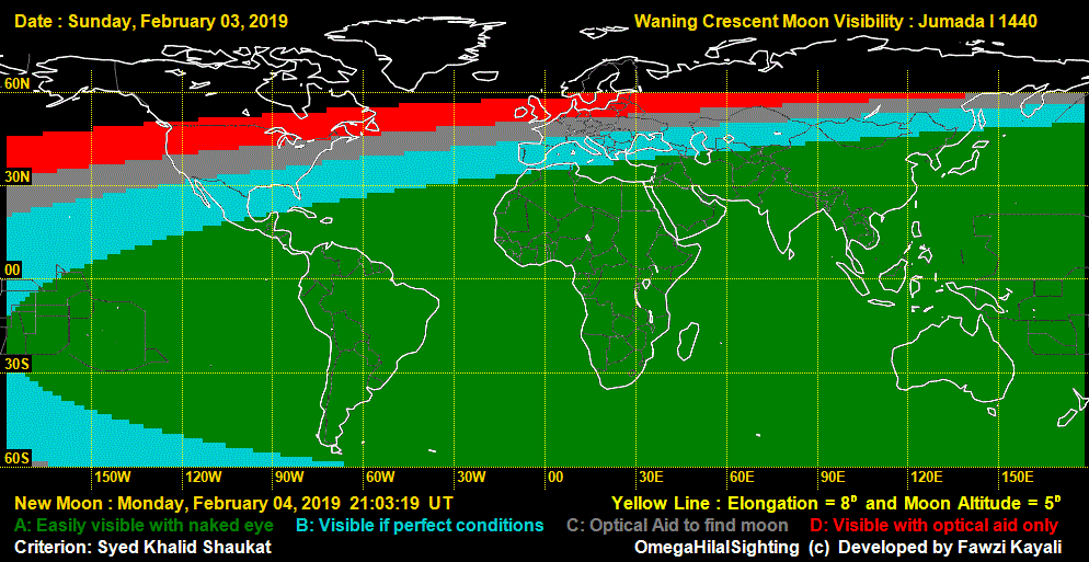 The Astronomical New Moon (conjunction) is on February 4, 2019 (Monday) at 21:03 UT. On February 4, there is no chance of sighting the moon anwhere in the world. On February 5, there is a small chance of sighting in Americas. On February 6, the moon can be seen in