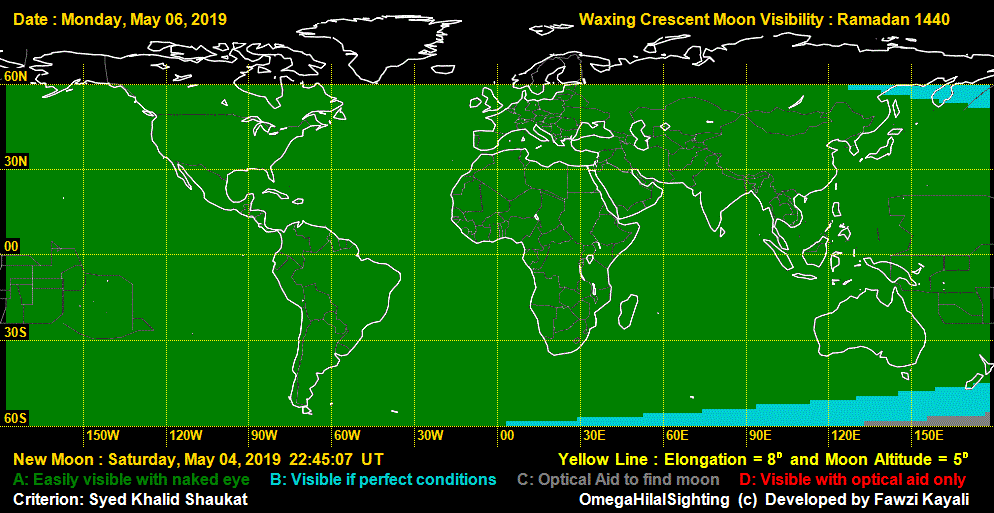The Astronomical New Moon (conjunction) is on May 4, 2019 (Saturday) at 22:47 UT. On May 4, there is no chance of sighting any where. On May 5, there is very small possibility of moonsighting by high powered telescope in Australia, Middle-East, and Europe. On May 5, Eastern Americas have small chance of seeing by human eye, and Western Americas have good chance of sighting. On May 6, the moon can be easily seen in the whole world (See visibility curves).