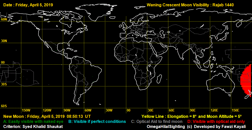 The Astronomical New Moon (conjunction) is on April 5, 2019 (Friday) at 8:50. On April 5, it is possible only by high powered telescope to see the moon in Americas and very small chance of sighting in Hawwaii and Polynesian Island. On April 6, the moon can be seen easily in almost the whole world except in Japan, New Zealand and Australia (See visibility curves).