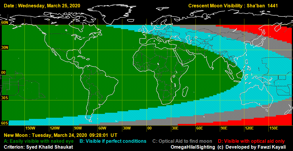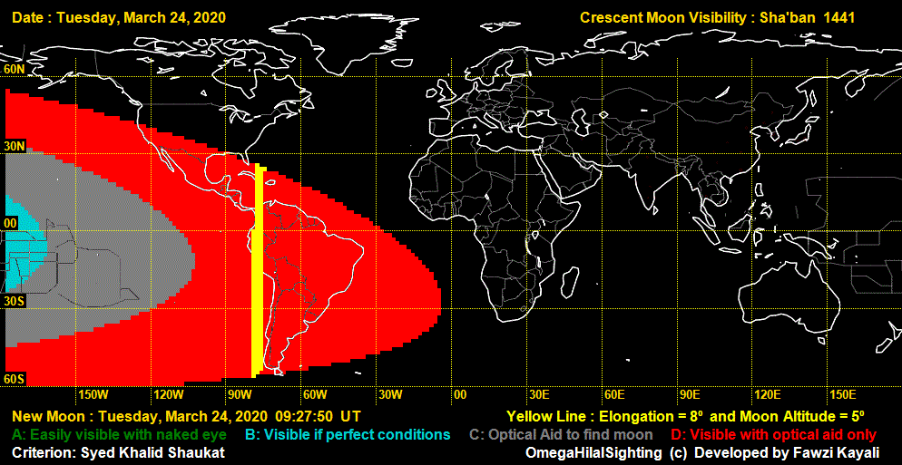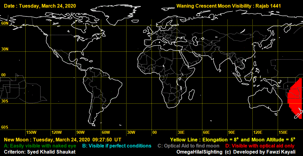 The Astronomical New Moon (conjunction) is on March 24, 2020 (Tuesday) at 9:28 UT. On that day, the moon can not be seen except by high powered telescope in Americas. On March 25, the moon can be seen with difficulty in Australia and easily in India, Pakistan, Middle East, parts of Europe, whole Africa and Americas (See visibility curves).