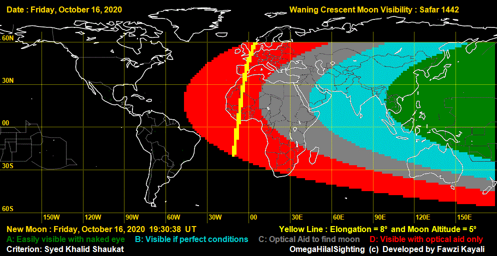 On October 16, the moon can not be seen any where in the world. On October 17, it may be seen in Middle-East, Africa, and Americas. On October 18, it is visible in the rest of the world (See visibility curves).