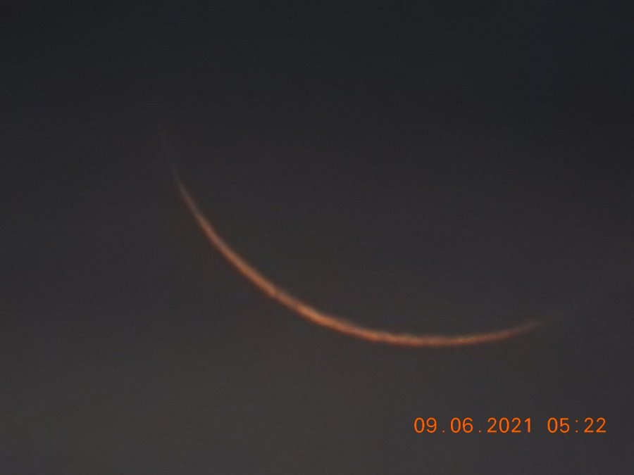 Above is Old Crescent Moon (End of Shawwal 1442 AH), Wednesday, taken by MCW member K.Mohammed Hussain Palayamkottai Tirunelveli, India (Lat: 8�43'36.88" N, & Long: 77�45'23.0" E); Time: 05:22 am IST. The illumination was 1.9 % & the Altitude was about 6� and horns were at 5 & 8 positions. Click on the photo above to see full size.