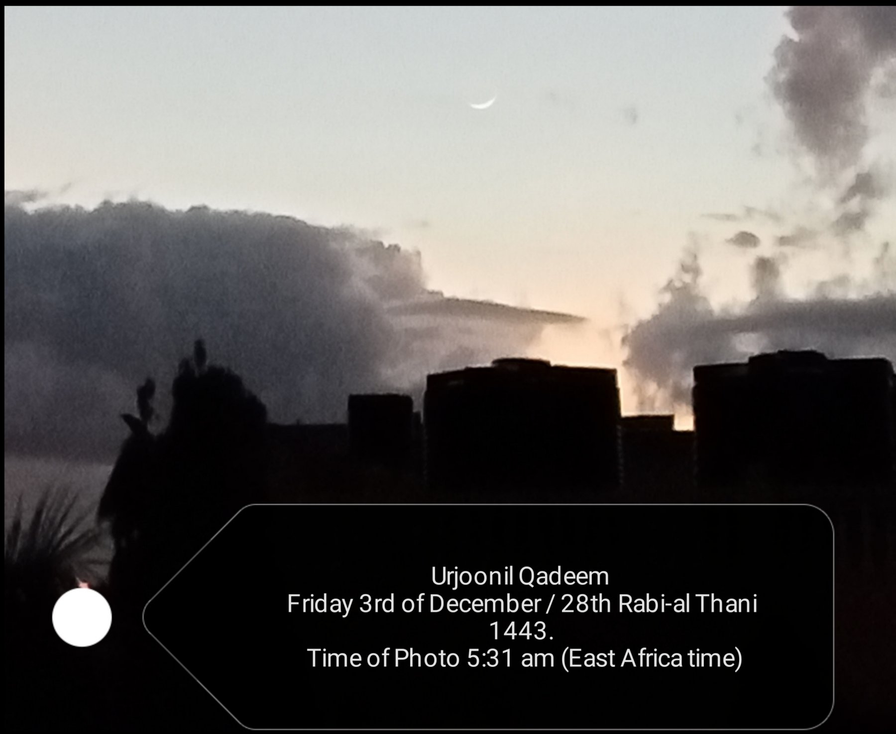 Above is the old Crescent Moon of Rabi-at-Thani 1443 AH, seen on December 3, 2021. MCW Member Muhammad Abubakar Said from Mombasa, Kenya. The weather was cloudy and it was raining at around 4:40 am East African time (the weather forecast was "Intermittent clouds" ). When the clouds moved on, the crescent was easily visible with the naked eye. Photo was taken at 5:31 am.