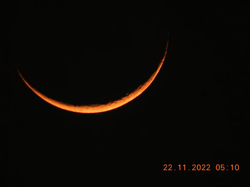 Here is the photo of Urjoonul Qadeem (Waning Crescent moon) taken today Tuesday 28th of Rabiul Aakhir 1444 (22 nd November 2022) by MCW member K.Mohammed Hussain Palayamkottai Tirunelveli, Tamil Nadu, India (Latitude 8�43'36.3"N and Longitude 77�45'22.9"E). Time 5:10 am IST. The Illumination was about 5 % The Altitude was around 9� and horns were at 3 & 8 O'Clock.