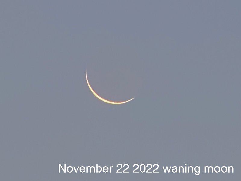 MCW member Dr. Javad Torabinejad reported: I saw the waning crescent in Blacksburg, VA on November 22. The first sighting (naked eye) was shortly after 6:00 am (Moonrise and sunrise at 5:33 and 7:09 am EST, respectively).