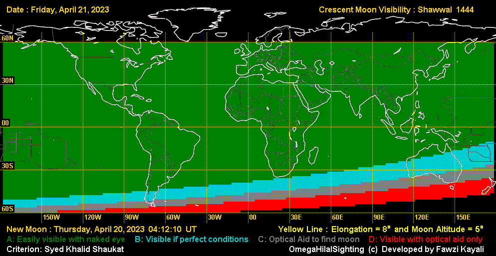 (Note by Moonsighting.com)Official announcement is that Eid-alFitr is on Friday April 21, 2023.