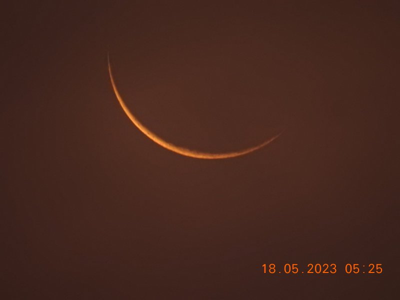 The old crescent of Shawwal 1444 AH was seen today Thursday 28th of Shawwal 1444 (18th May 2023), taken by me from Palayamkottai Tirunelveli, Tamil Nadu, India. Time 5:25 am IST and horns were 4 to 10 O'Clock.