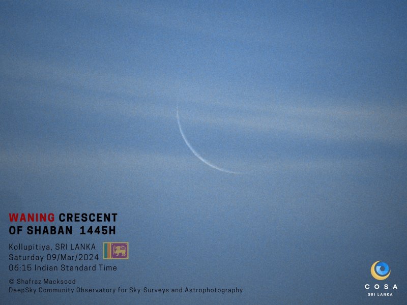 The old crescent of Shaaban 1445 AH was seen on Friday, March 9, 2024, before sunrise from Colombo, Sri Lanka.