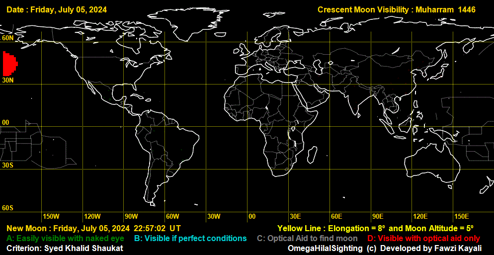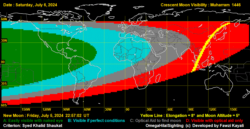 On July 5, the crescent can not be seen anywhere. On July 6, with difficulty it may be seen in North Western Africa, but can easily be seen in Americas. On July 7, it can be seen in the whole world. (See visibility curves).