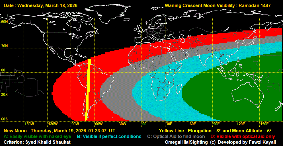 ???? | Turkey (Possibility of sighting by telescope anywhere OR elongation > 8� & Altitude > 5� anywhere) |