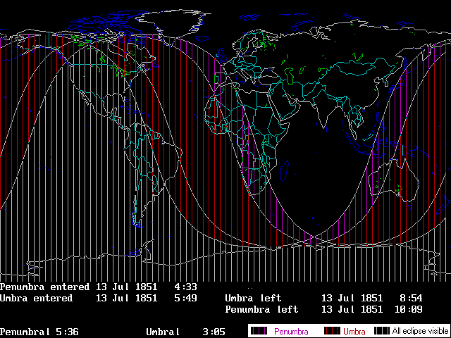 Starts 11:21 Max. 12:51 Ends 14:22 | Lunar Eclipse cannot be seen in Asia, Europe and Africa. It was day time in Qadian and moon was below horizon. | Both lunar and solar eclipses were not visible in India. Moreover, this happened before Miraz's claim of Mahdi when he was 11 or 12 years old. |